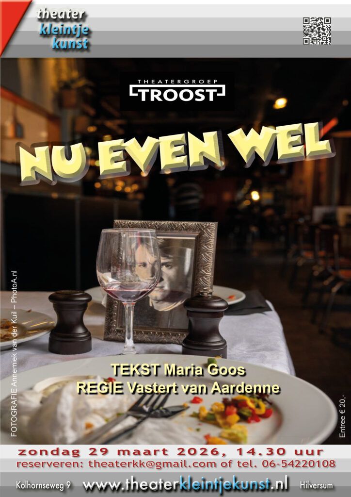 Theatergroep Troost speelt Even wel, een scherpe en herkenbare tragi-komedie van Maria Goos. In dit toneelstuk staat een confronterende ontmoeting centraal die allesbehalve rustig verloopt.