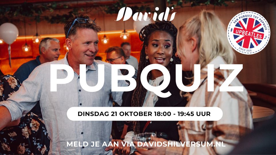 Daag jezelf uit tijdens de maandelijkse pubquiz bij David’s. Elke derde dinsdag van de maand draait het om plezier, gezelligheid en het testen van je kennis. In acht rondes komen de meest uiteenlopende onderwerpen voorbij: van sport en topografie tot geschiedenis, wetenschap en politiek. Natuurlijk ontbreekt de muziekronde niet, zodat je ook je oren aan het werk kunt zetten. Vorm een team van maximaal zes personen en strijd mee voor de winst. Vooraf een hapje eten in het restaurant maakt je avond helemaal compleet.
