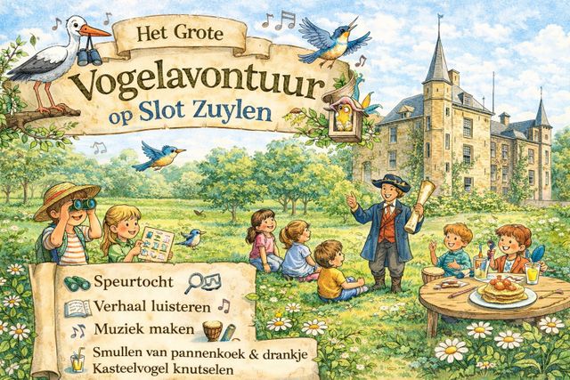 Een spiksplinternieuw kinderavontuur bij Slot Zuylen! Kom in de meivakantie met het hele gezin naar Slot Zuylen en beleef het Grote Vogelavontuur. Een kasteel vol gefladder, muziek, verhalen, knutsels en lekkers. Door het hele kasteel en in de tuin speur je naar kleurrijke vogels.