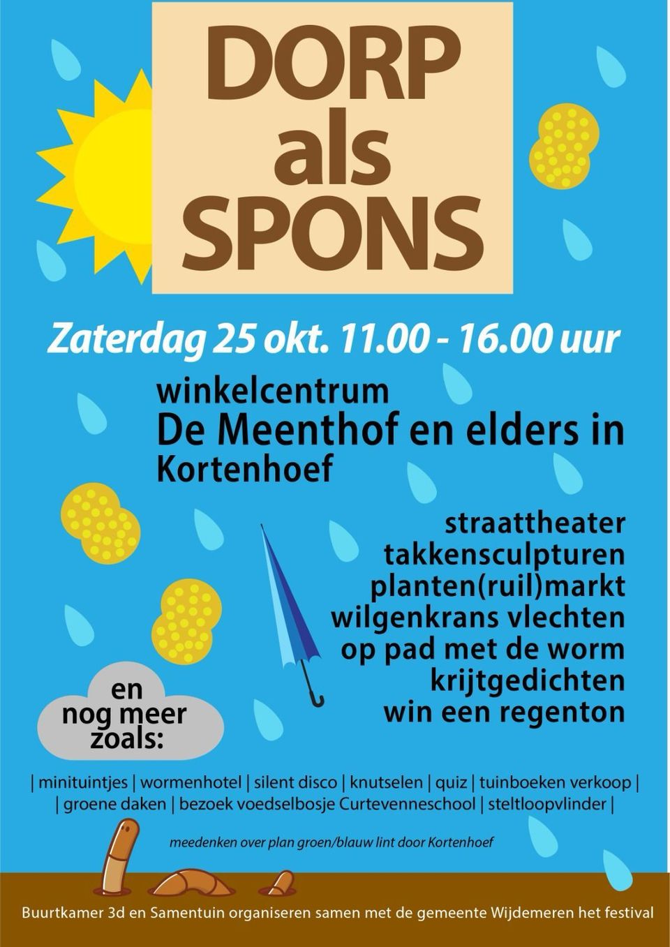 Festival ‘Het dorp als spons’ viert het groen van Kortenhoef. Laat je inspireren om het dorp groener, koeler en leefbaarder te maken. Op de groene markt ruil je zaden en planten, ontdek je wilde bloemen, mini-tuintjes en (moes)tuinboeken. Leer kransen vlechten van wilgentenen, dans mee bij de silent disco in het groen en bekijk de film Onder het maaiveld. Bezoek ook het Voedselbosje met het wormenhotel en ontdek hoe groen helpt tegen hitte en droogte. Een dag vol natuur, muziek en inspiratie voor een veerkrachtig dorp.