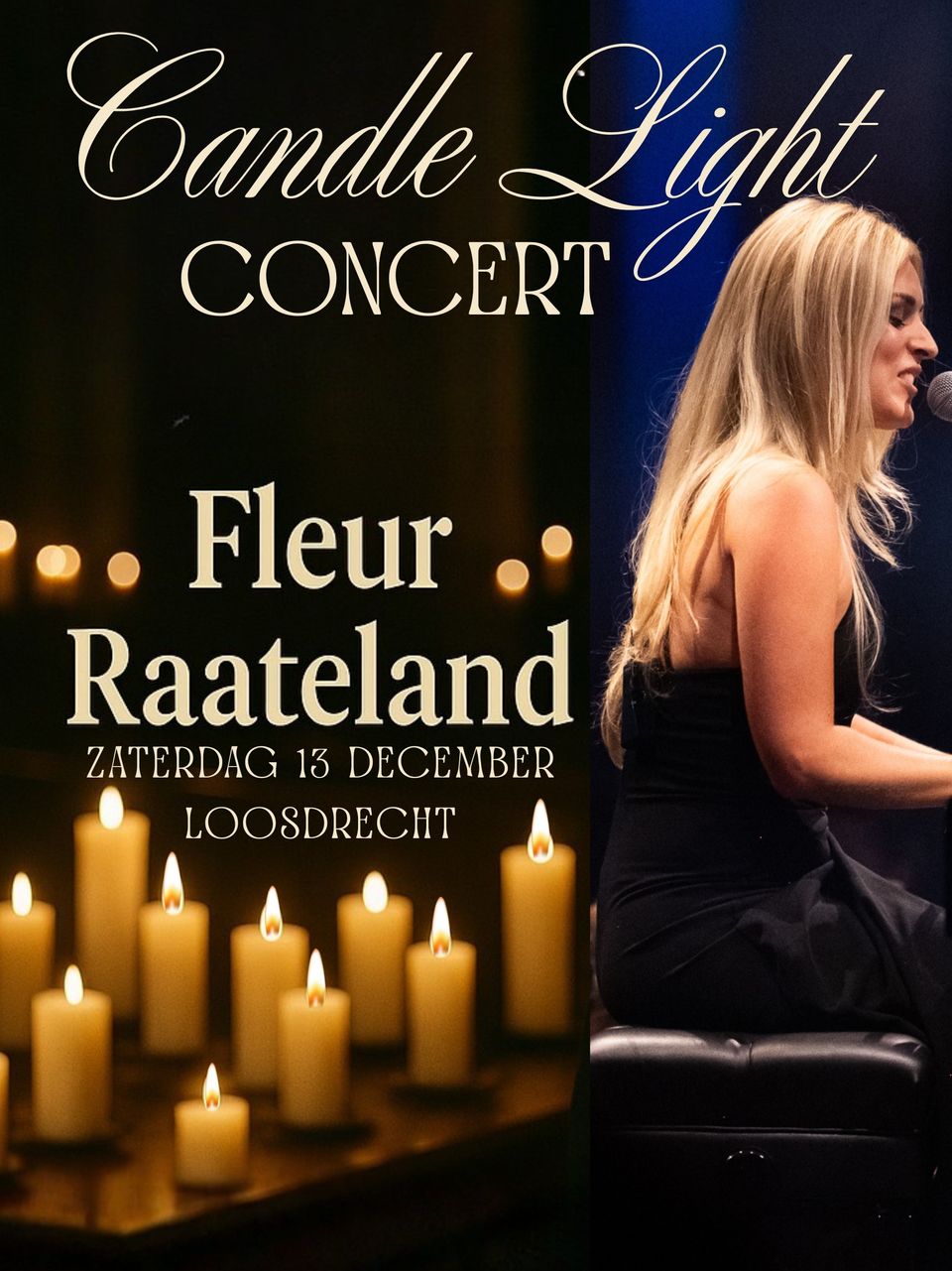 Tijdens het Candle Light Concert op zaterdag 13 december brengt zangeres en pianiste Fleur Raateland haar prachtige stem tot leven in een intieme setting vol kaarslicht. De warme gloed, het zachte schijnsel en de muziek zorgen samen voor een betoverende avond.