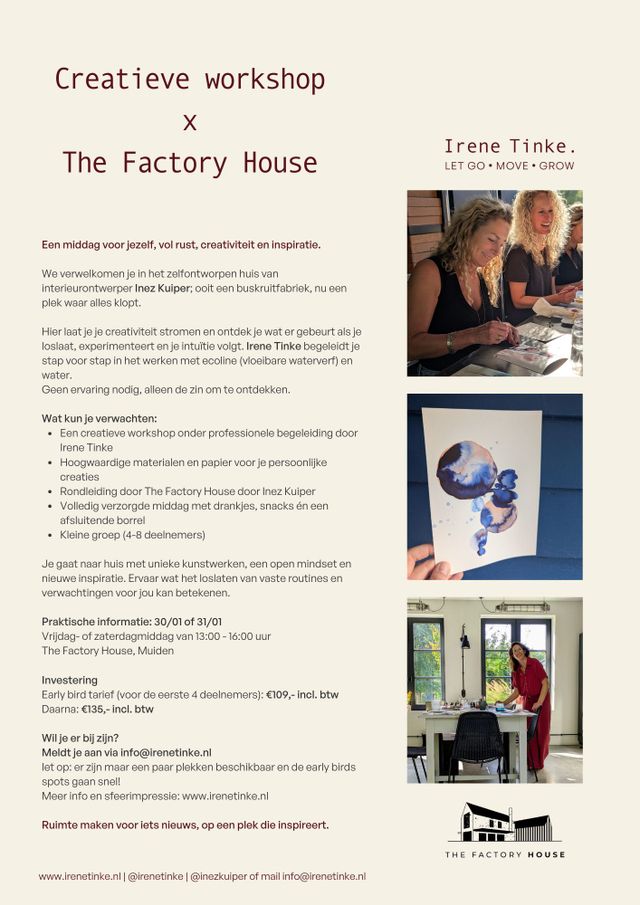 - Een bijzondere inspiratieronde door interieurontwerper Inez Kuiper waarin zij haar persoonlijke verhaal deelt over het ontstaan van The Factory House: van een oude fabriek tot dit unieke zelfontworpen huis. Tijdens deze rondleiding ontdek je hoe het huis én de tuin zijn vormgegeven en hoe Inez haar visie en gevoel hierin heeft vertaald. De rondleiding brengt een moment van inspiratie en pauze binnen het creatieve proces.